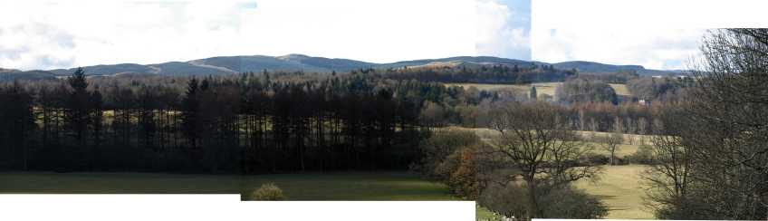 looking from near the turn to Altizourie, on the B7045. The tower of Blairquhan castle visible to the right. In the background, Green Hill of Knockgardner and Black Hill of Knockgardner. © Jonathan Meuli : 75mm lens : from NS 37288 06501: 13th March 2013 : part 3 of 180° panorama