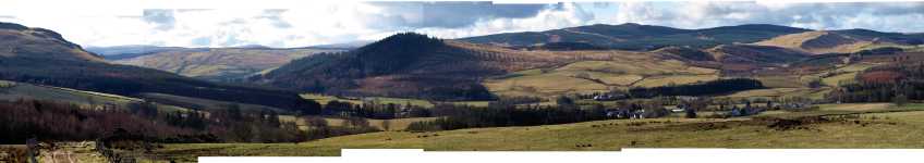 Straiton seen from junction of two paths: the old track to Patna, and the path to Altizourie. Looking SW, you can see wooded Bennan hill in the centre. To its left, the Girvan valley goes up into the Galloway forest, past Linfairn, visible on the far side of the valley. Centre right, the white houses of Straiton, with Back Fell in the distance above. To the right, Green and Black Hill of Knockgardner. ©Jonathan Meuli : 75mm lens : from NS 38900 06013: 13th March 2013 : part 2 of approx 160° panorama